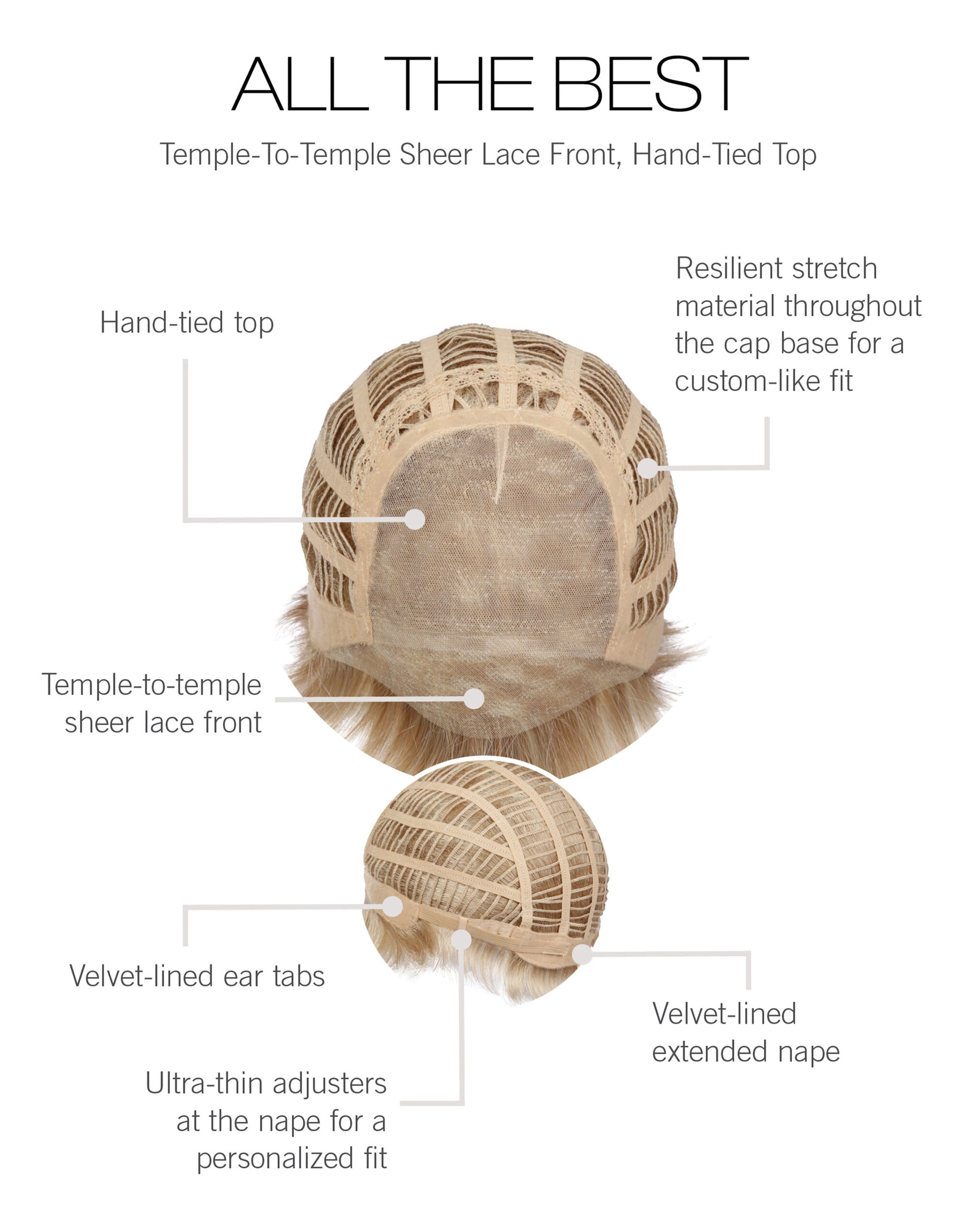 Cap Construction: Temple-To-Temple Lace Front, Hand-Tied Top, Velvet-Lined Ear Tabs, Velvet-Lined Extended Nape