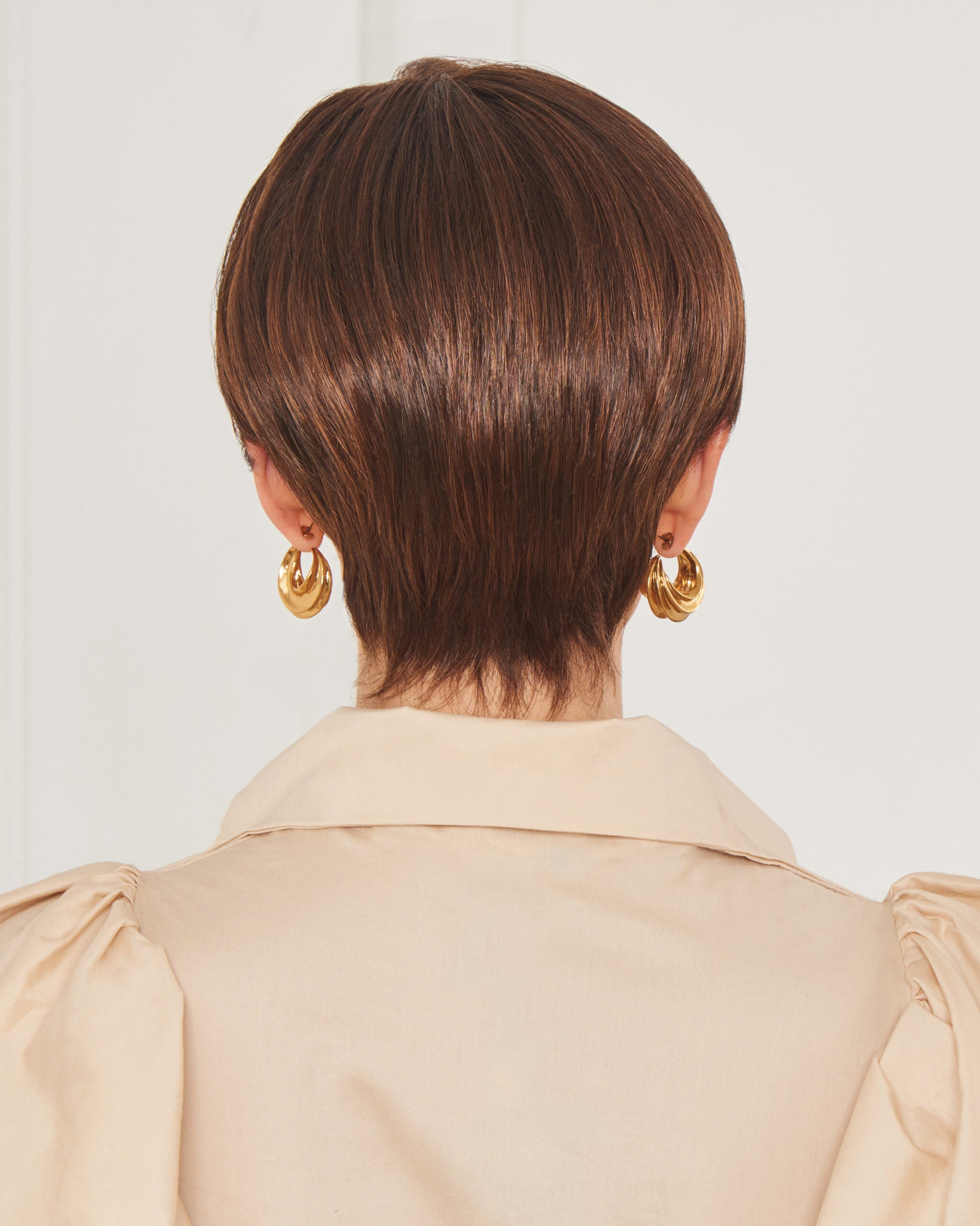 This ultra-light sculpted short style is a modern classic with all the best features. A hand-tied top allows for versatile parting, while the extended lace front extends seamlessly to the ear tabs, providing a natural look. The low-density fiber creates airy movement, with side-sweeping bangs that flatter and frame the face. The neck-hugging nape ensures a polished, tailored style that’s easy to wear and maintain—ideal for anyone seeking an effortlessly stylish look.