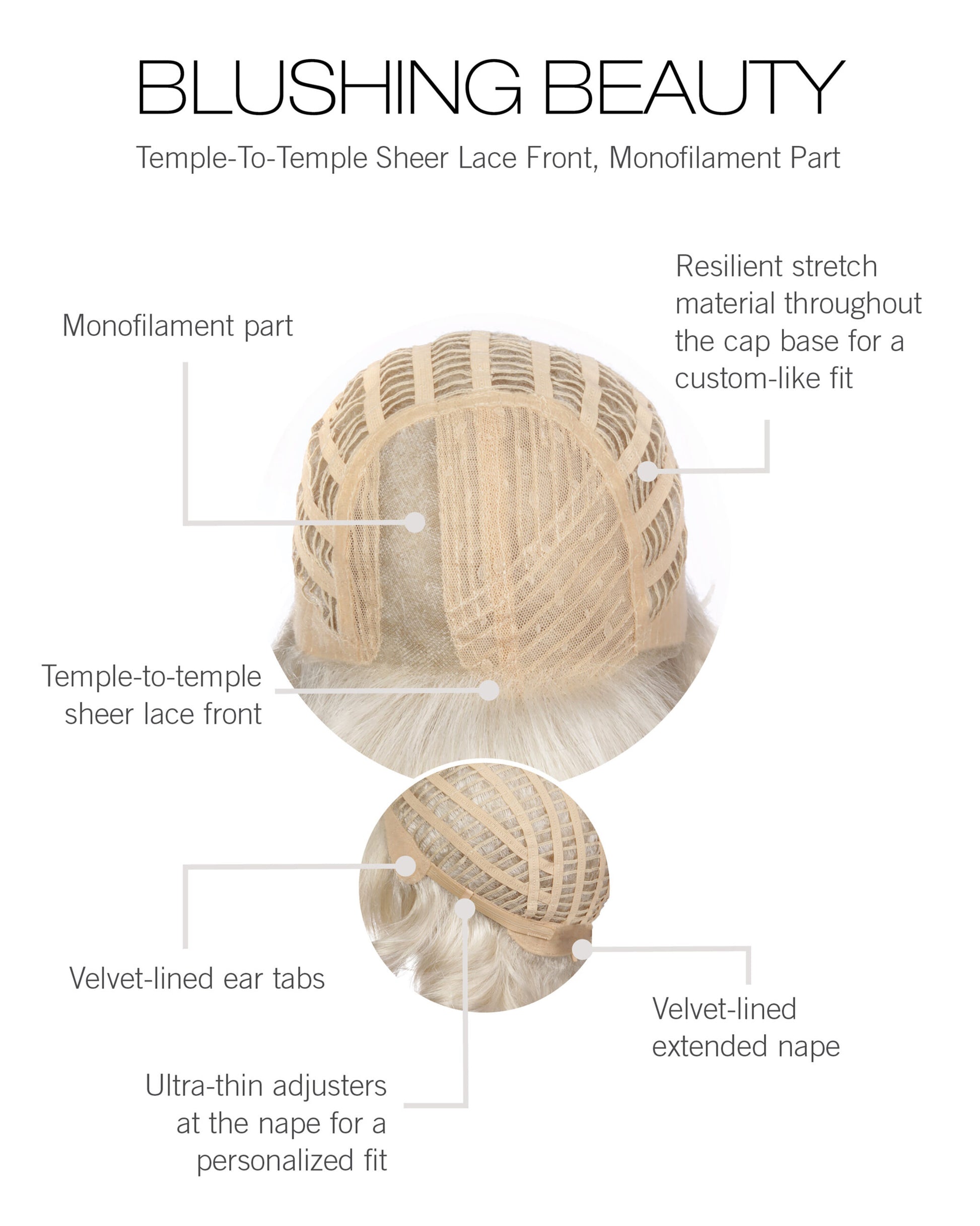 Blushing Beauty is a soft, salon-inspired barrel curls style that is both flattering and easy to personalize. This low-density style is highly versatile—simply mist to enhance the texture or brush through for a fuller, more sophisticated look. The lace front hairline runs from ear to ear, and the monofilament part extends all the way to the crown, offering a natural part line and the flexibility to wear it off the face or with a sweeping bang.