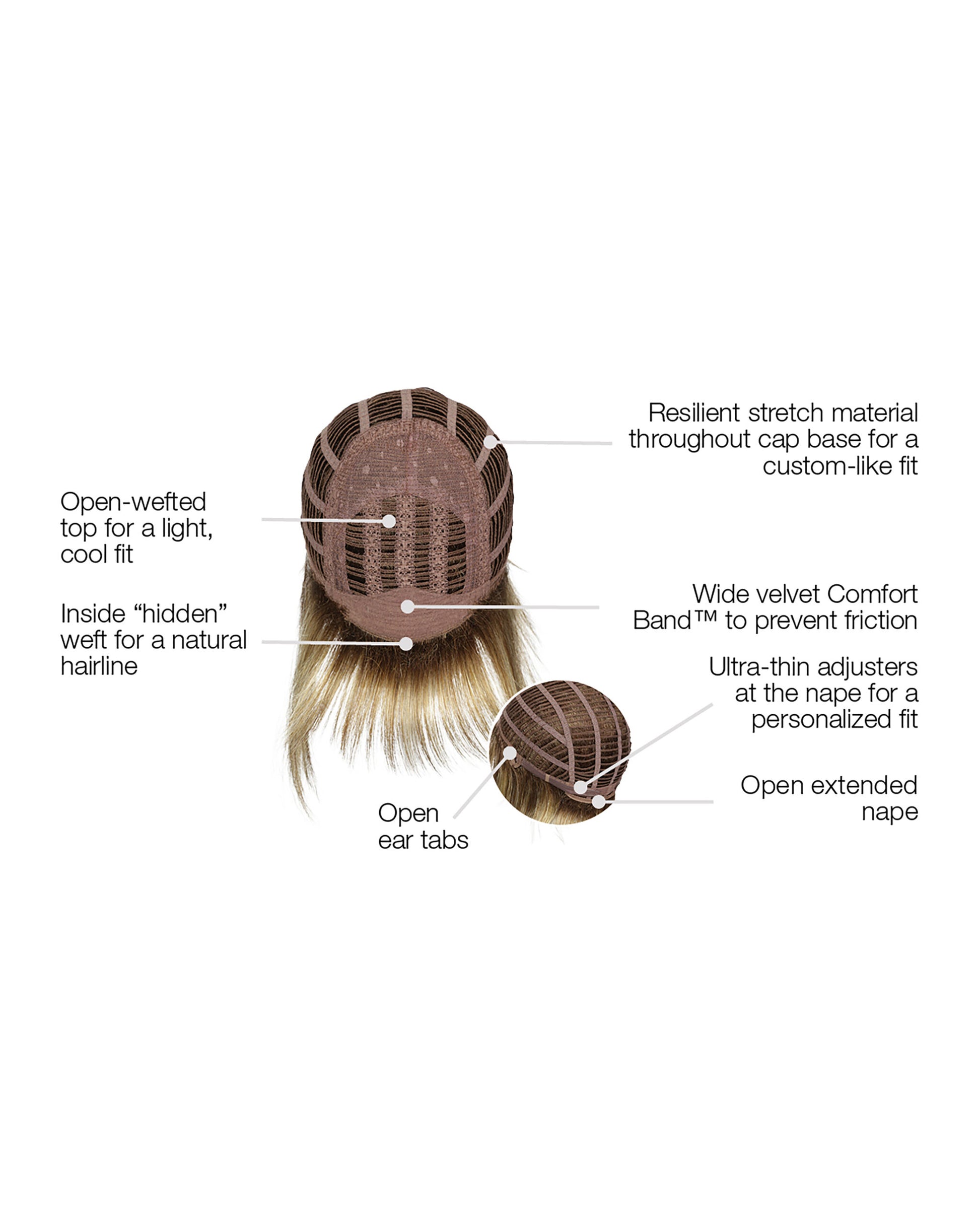 Chic Choice is a sculpted style featuring stacked layers at the nape and longer, disconnected face-framing layers at the sides. A tapered fringe completes this look, drawing attention to the eyes. Designed with the Wide Velvet Comfort Band™ and open wefted top for added comfort and breathability, this wig ensures a secure and natural fit with its Inside “Hidden” Weft and open ear tabs. Crafted with Kanekalon Flexlite® Fiber, it offers heat styling versatility.