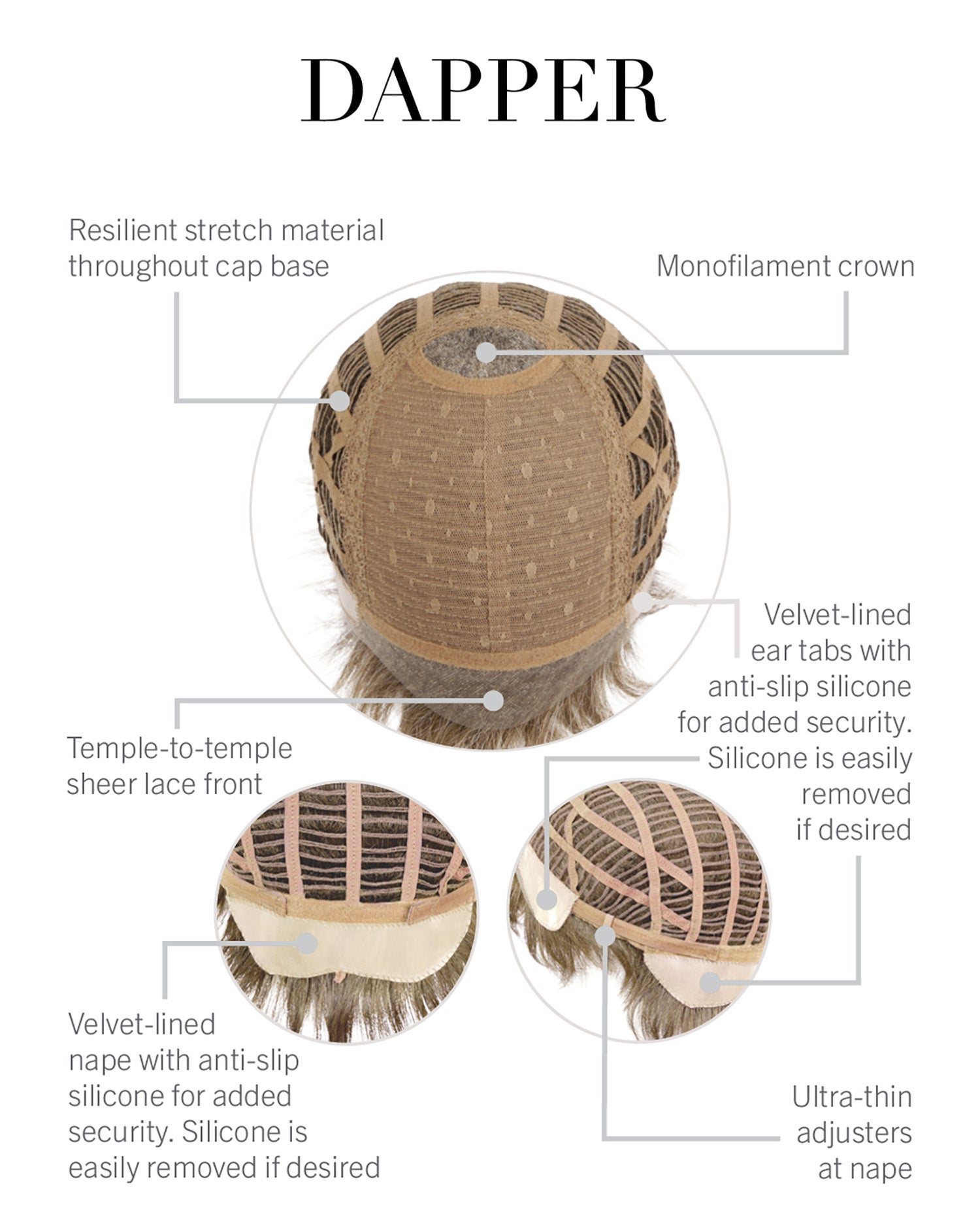 Cap Construction: Temple-To-Temple Lace Front, Monofilament Crown, Anti-Slip Silicone-Lined Ear Tabs, Anti-Slip Silicone-Lined Extended Nape