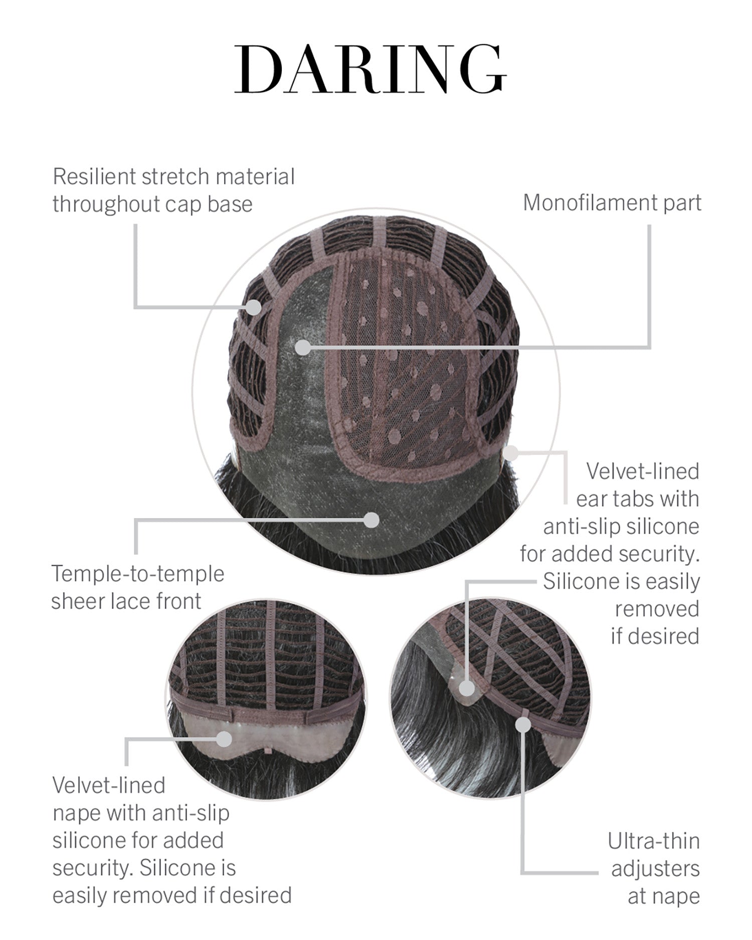 Cap Construction: Temple-To-Temple Lace Front, Monofilament Part, Anti-Slip Silicone-Lined Ear Tabs, Anti-Slip Silicone-Lined Extended Nape