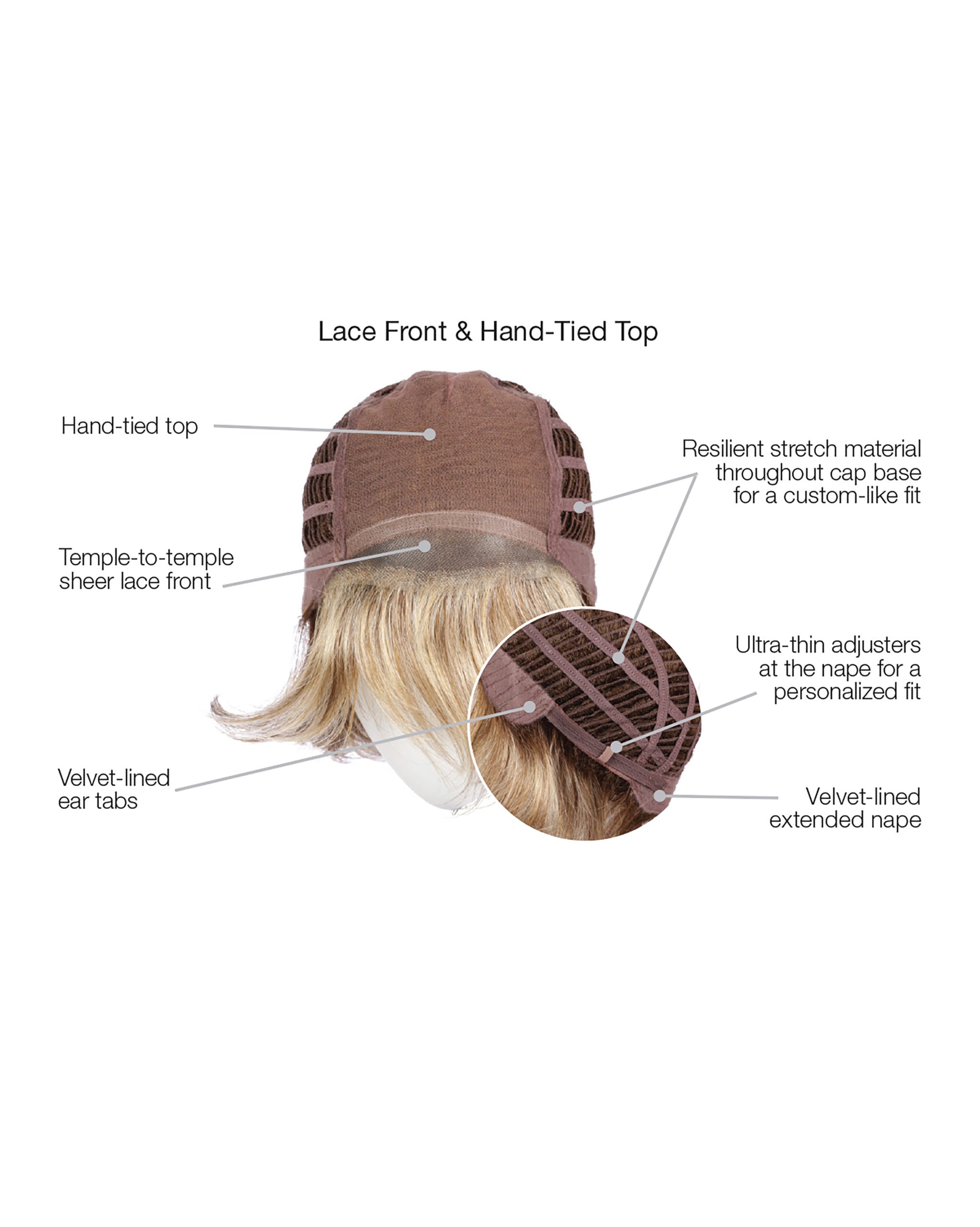 Cap Construction: Temple-To-Temple Lace Front, Hand-Tied Top, Velvet-Lined Ear Tabs, Velvet-Lined Extended Nape