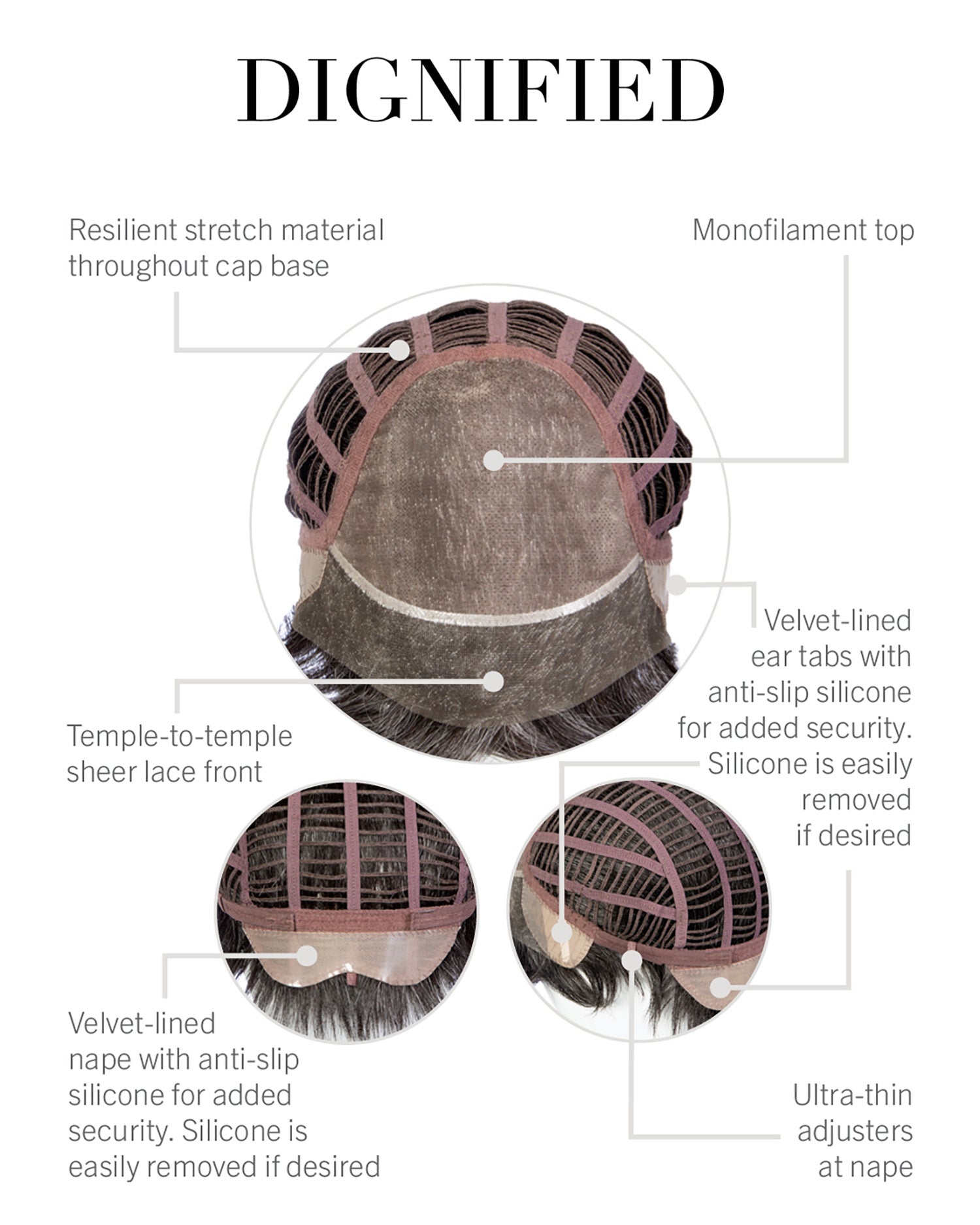 Cap Construction: Temple-To-Temple Lace Front, Monofilament Top, Anti-Slip Silicone-Lined Ear Tabs, Anti-Slip Silicone-Lined Extended Nape