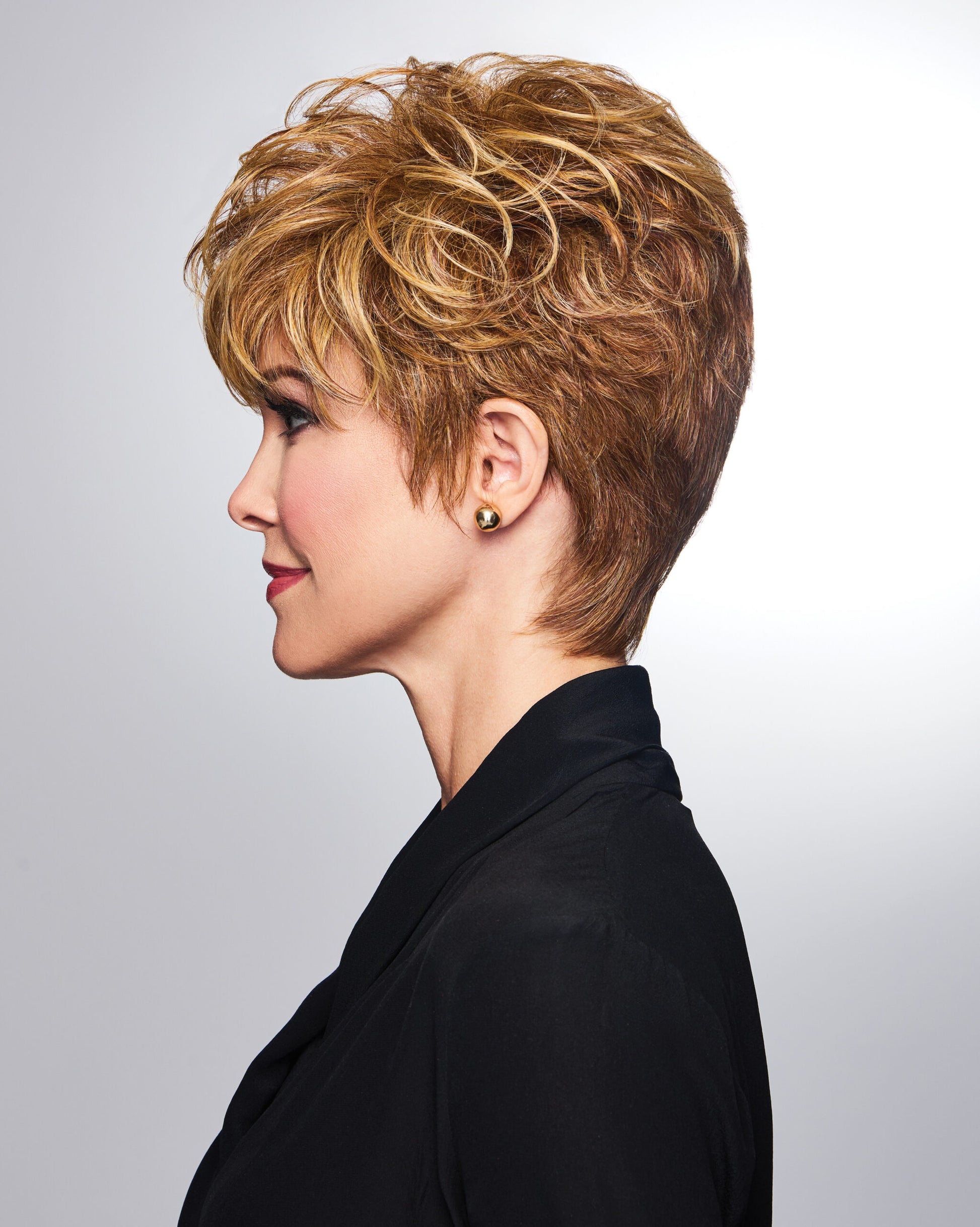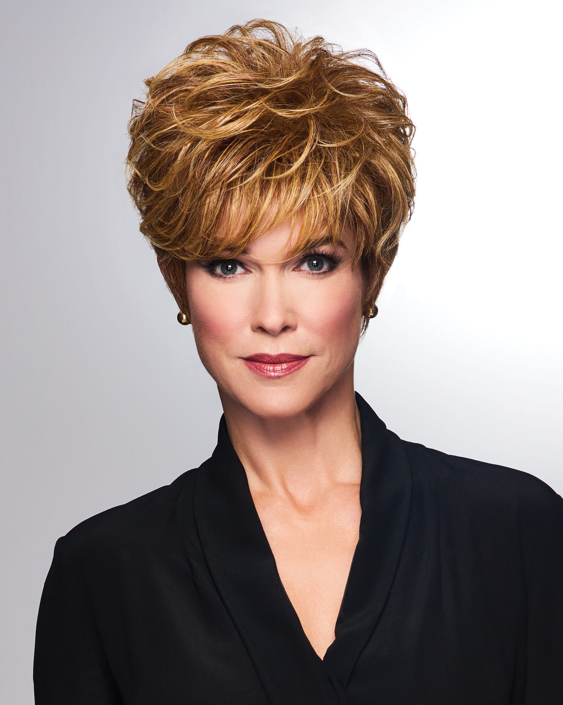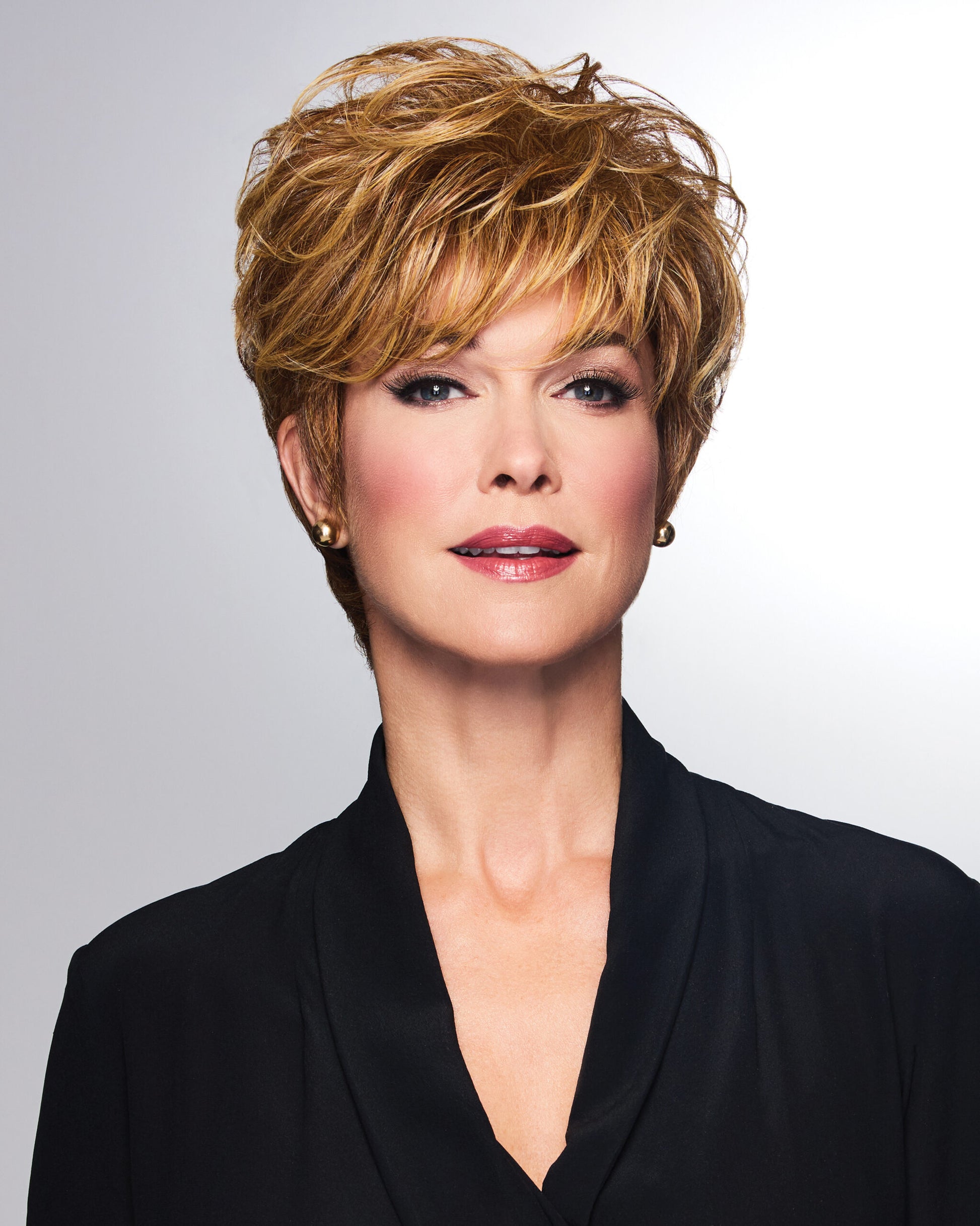 Full Fringe Pixie is contemporary tapered short cut features sides and nape that sit close to the head, with longer layers on top for lots of playful volume. A sophisticated gentle wave throughout gives the overall style modern texture and movement. The Wide Velvet Comfort Band™ provides added comfort, and the Inside “Hidden” Weft, open ear tabs, and open extended nape ensure a secure fit. The Tru2Life® heat-friendly synthetic hair offers versatility for styling.