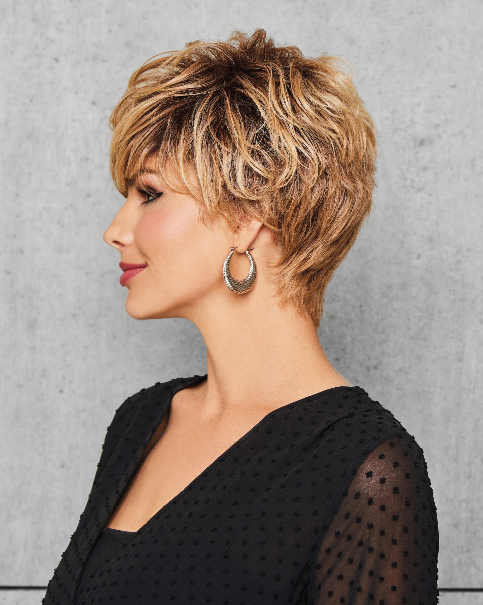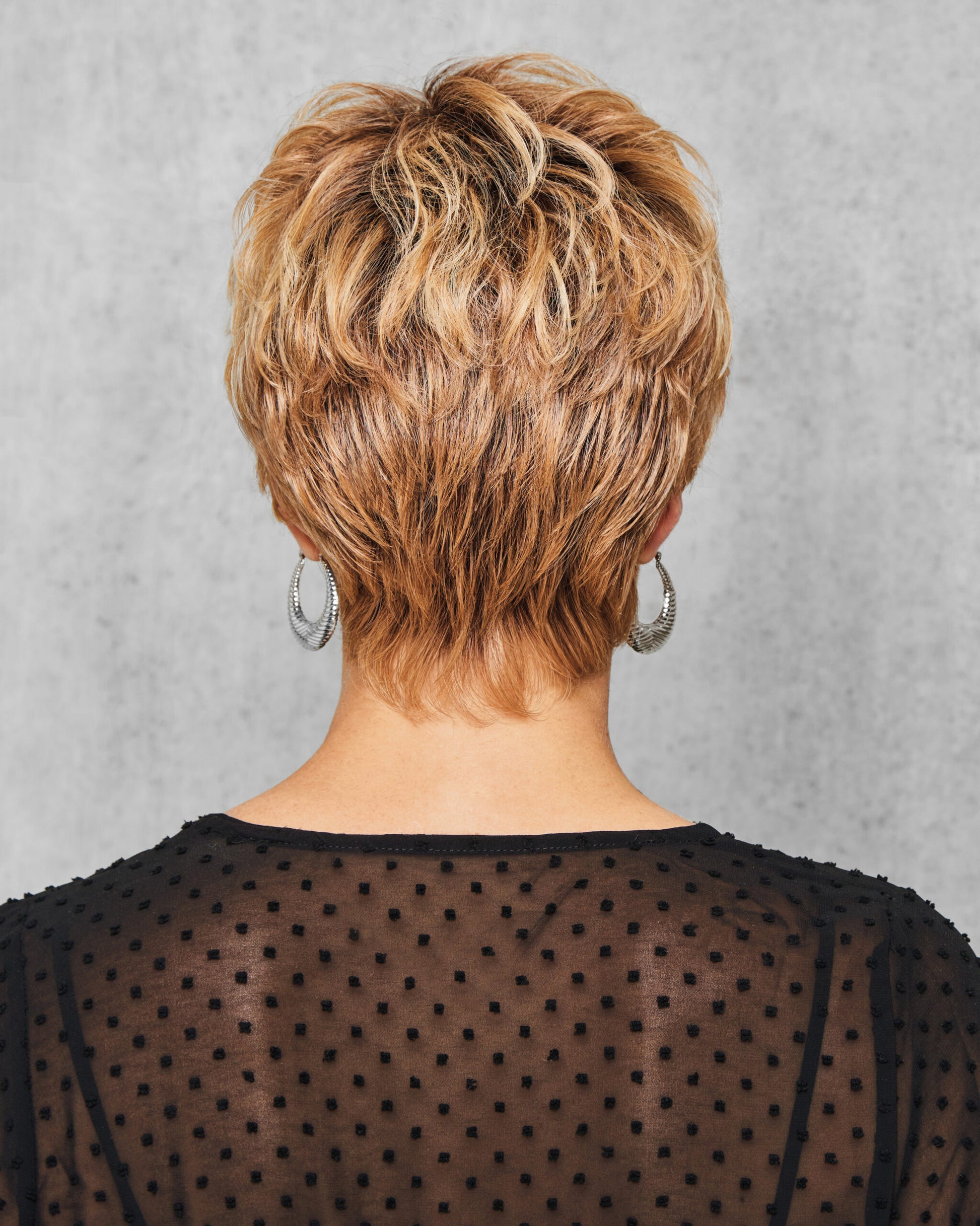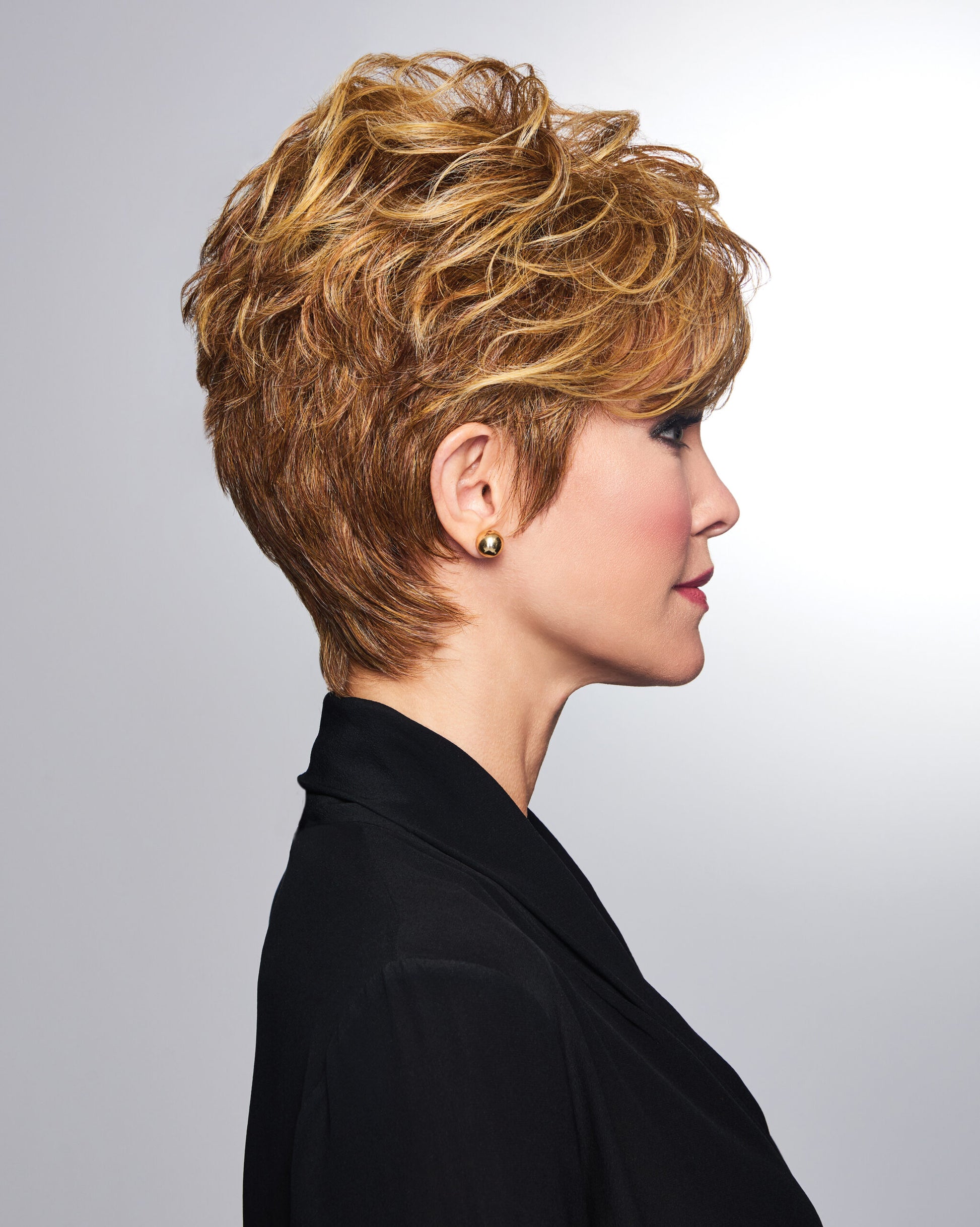 Full Fringe Pixie is contemporary tapered short cut features sides and nape that sit close to the head, with longer layers on top for lots of playful volume. A sophisticated gentle wave throughout gives the overall style modern texture and movement. The Wide Velvet Comfort Band™ provides added comfort, and the Inside “Hidden” Weft, open ear tabs, and open extended nape ensure a secure fit. The Tru2Life® heat-friendly synthetic hair offers versatility for styling.