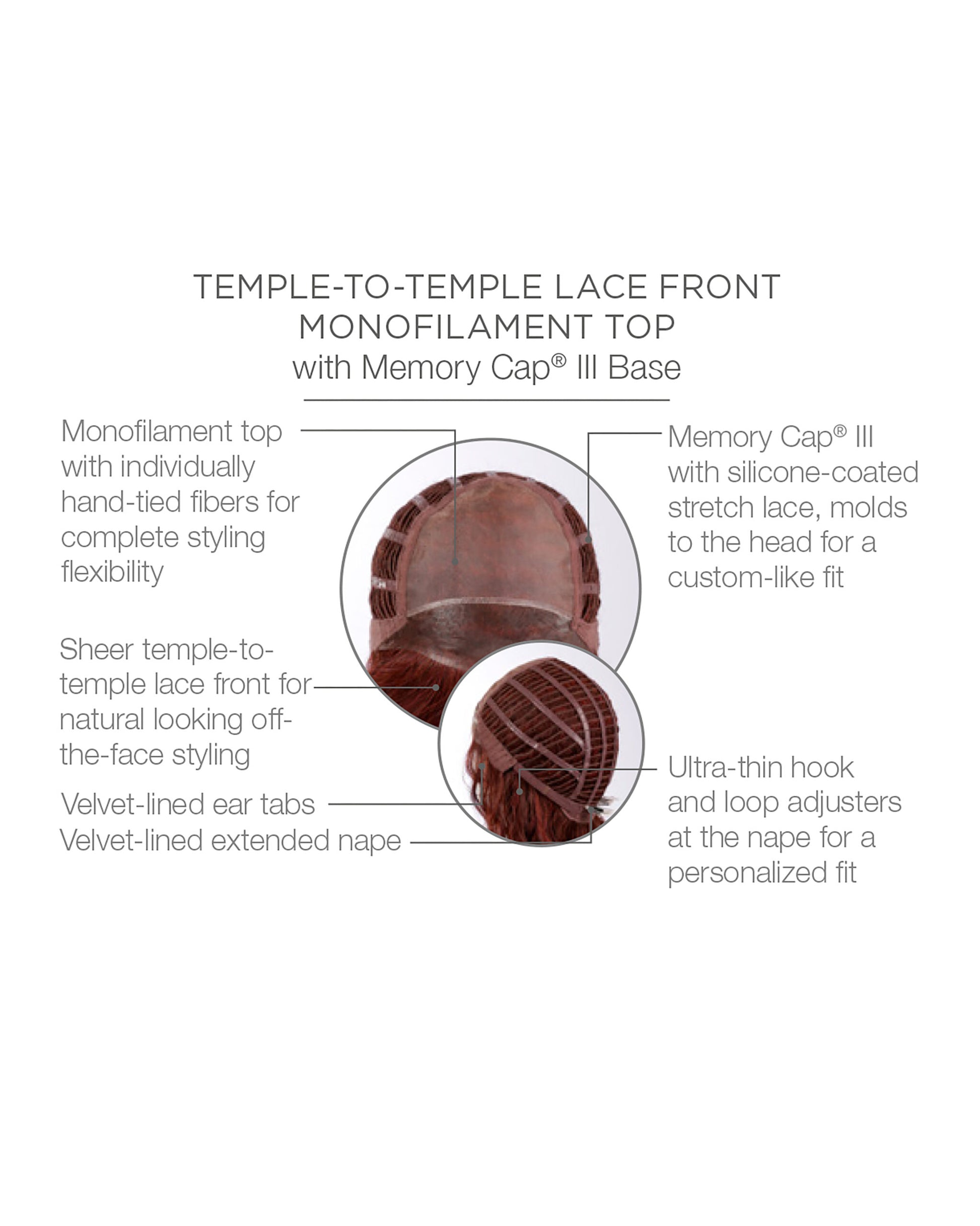 Cap Construction: Temple-to-Temple Lace Front, Monofilament Top, Memory Cap® III, Velvet-Lined Ear Tabs, Velvet-Lined Extended Nape