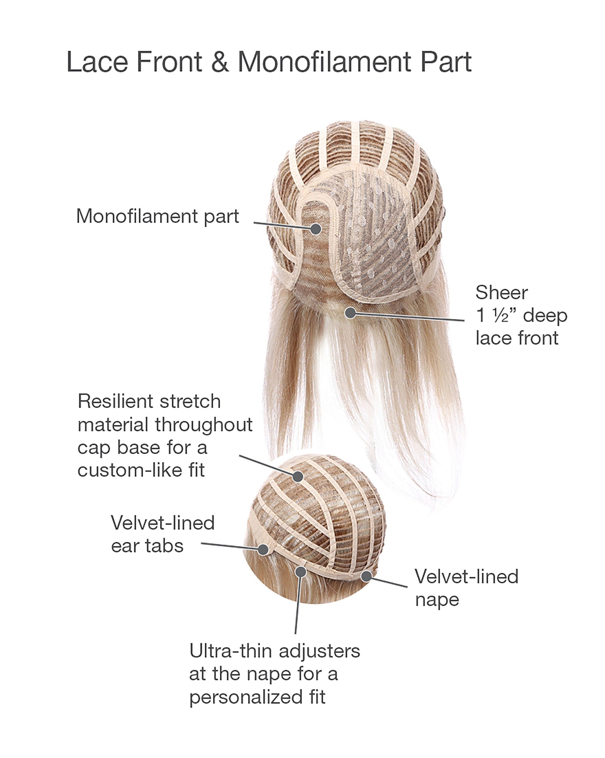 Cap Construction: Lace Front, Monofilament Part, Velvet-Lined Ear Tabs, Velvet-Lined Extended Nape