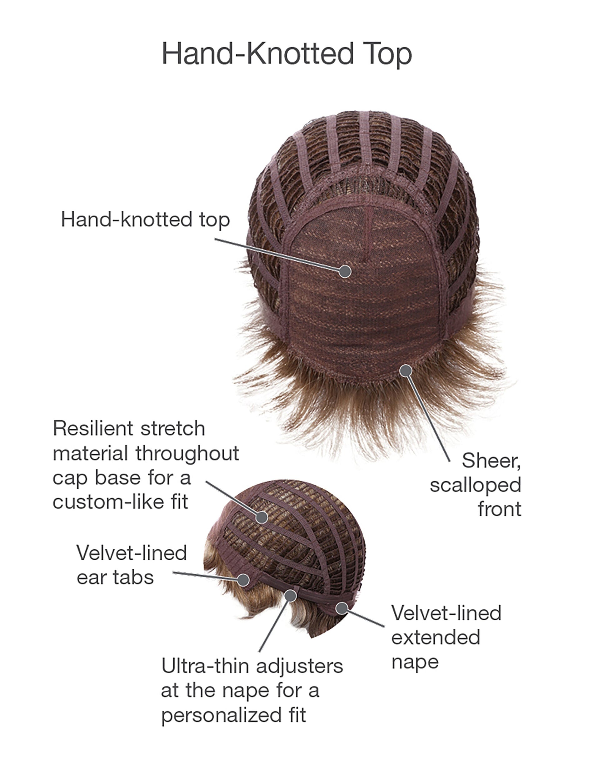 Cap Construction: Lace Front, Hand-Tied Top, Velvet-Lined Ear Tabs, Velvet-Lined Extended Nape