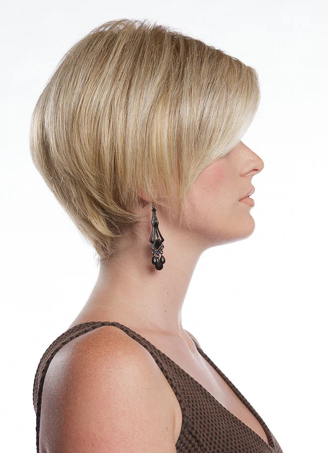 Joanie from the Moda+Bella Collection is a beautiful, textured modern style with side-swept bangs that adds a touch of sophistication to any look. The lace front hairline allows for off-the-face styling, while the heat-friendly fiber gives the wig a natural, human-hair-like feel. Perfect for those who enjoy versatility, Joanie can be styled with heat at low settings to suit your mood and occasion.