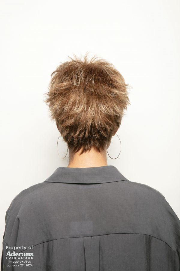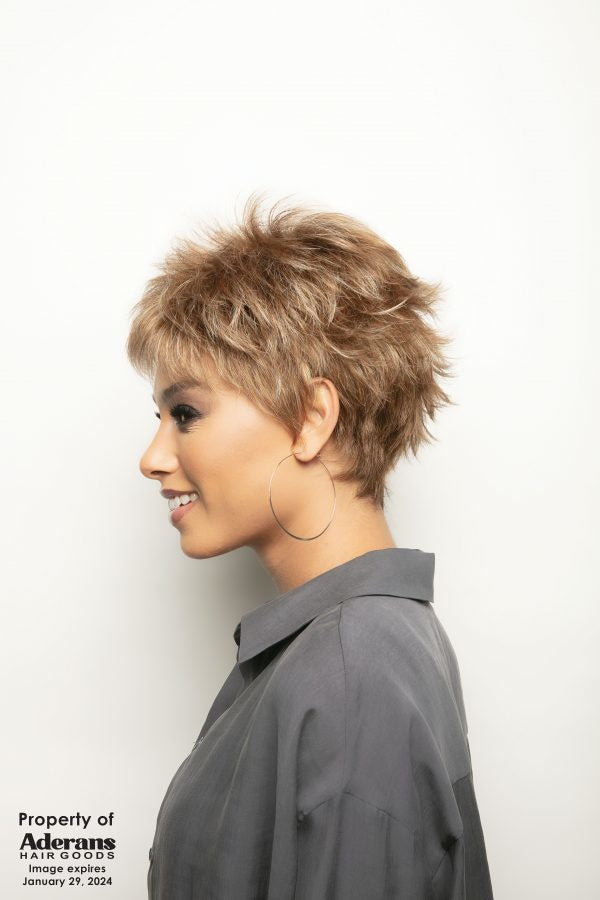 is a short-length synthetic wig that offers a stylish and trendy appearance. This straight, ready-to-wear wig features razor-finished layers and wispy bangs, creating a short and saucy look. It's designed for effortless wear—just shake it or spike it up and go. Lizzy is machine-made with adjustable tabs in the back nape area, ensuring a comfortable fit. The result is a natural look that is both fashionable and easy to wear.