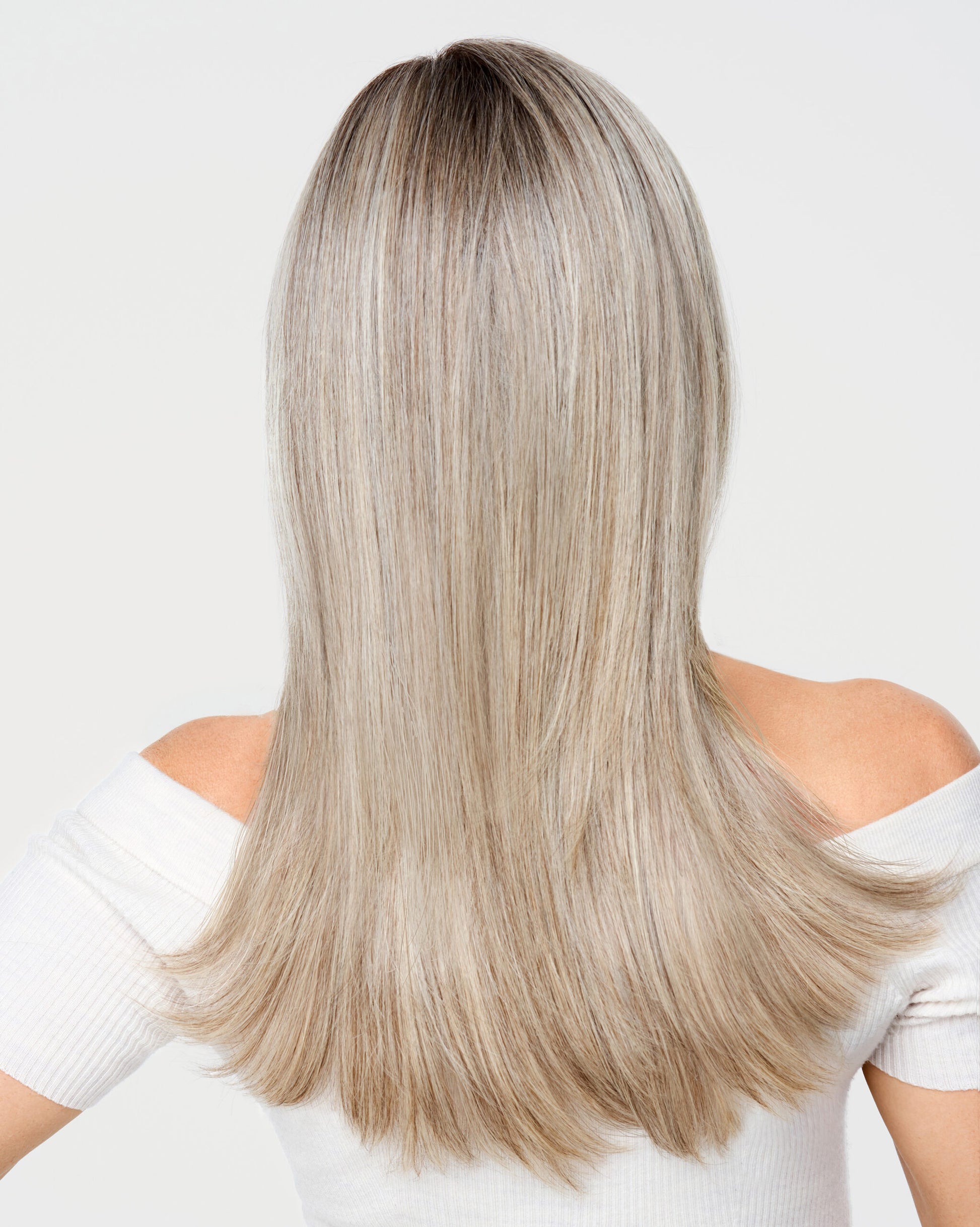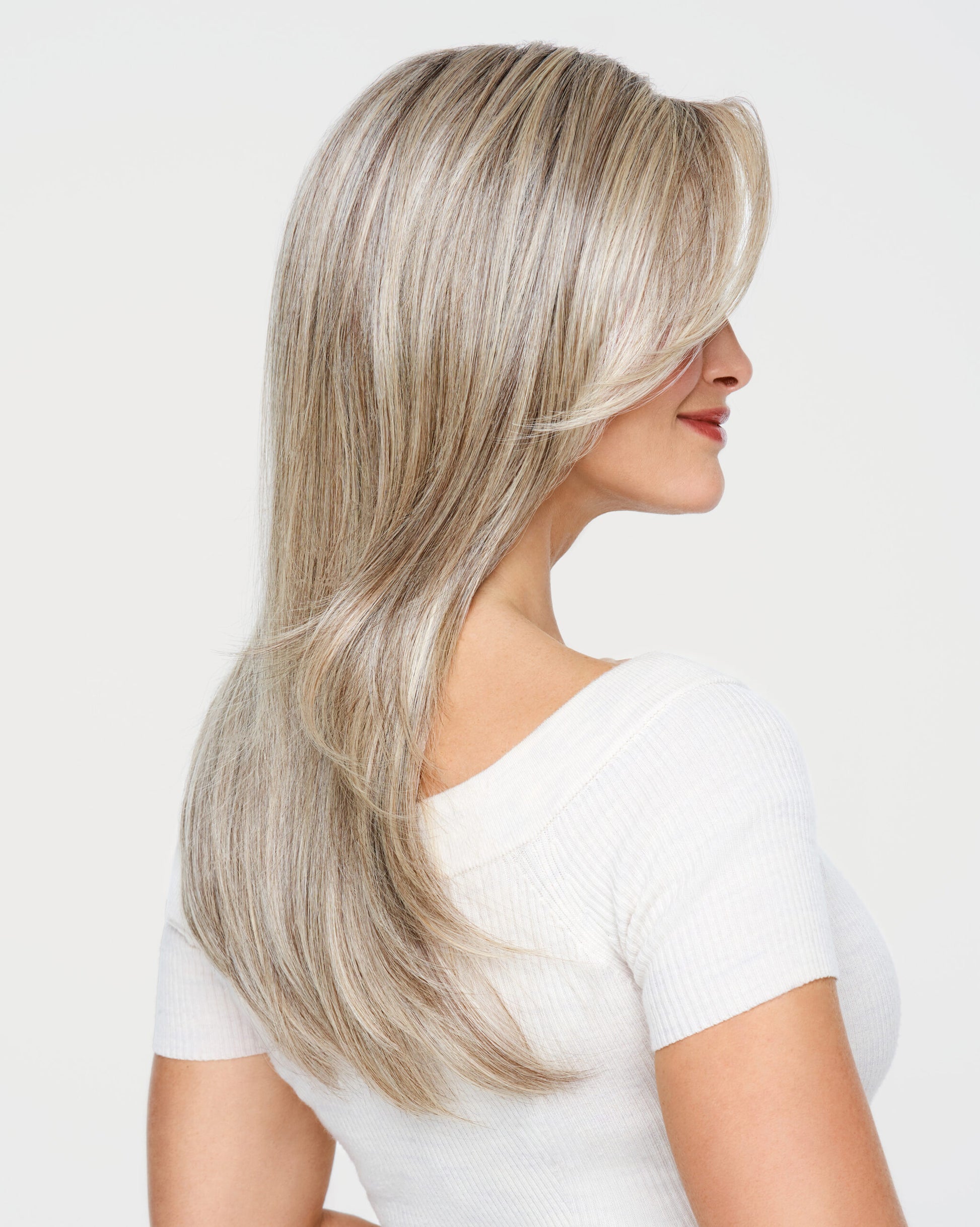 A classic longer look that is tailored and polished, like a professional blowout with a salon-quality finish. The long, side-sweeping fringe frames the face. More than just smooth and glossy, this style is lightweight, comfortable, and easy to wear. Confidently pull into a ponytail, thanks to the hand-tied base and extended lace front.