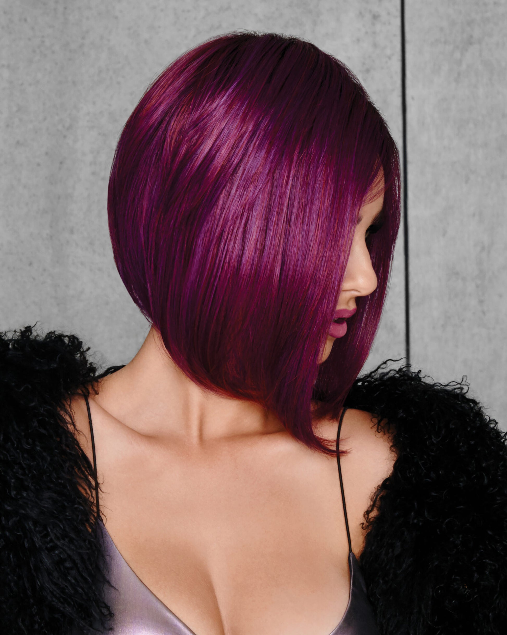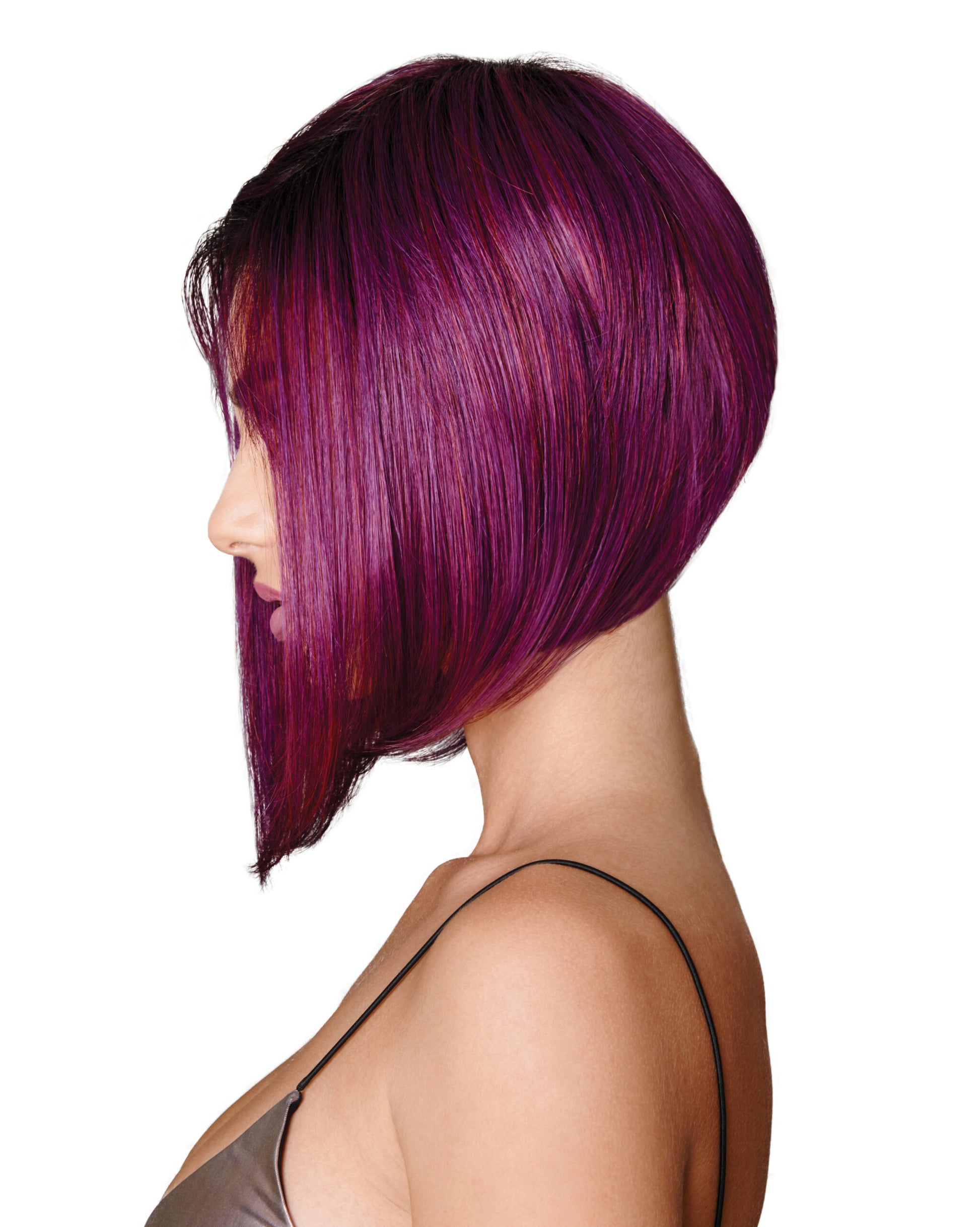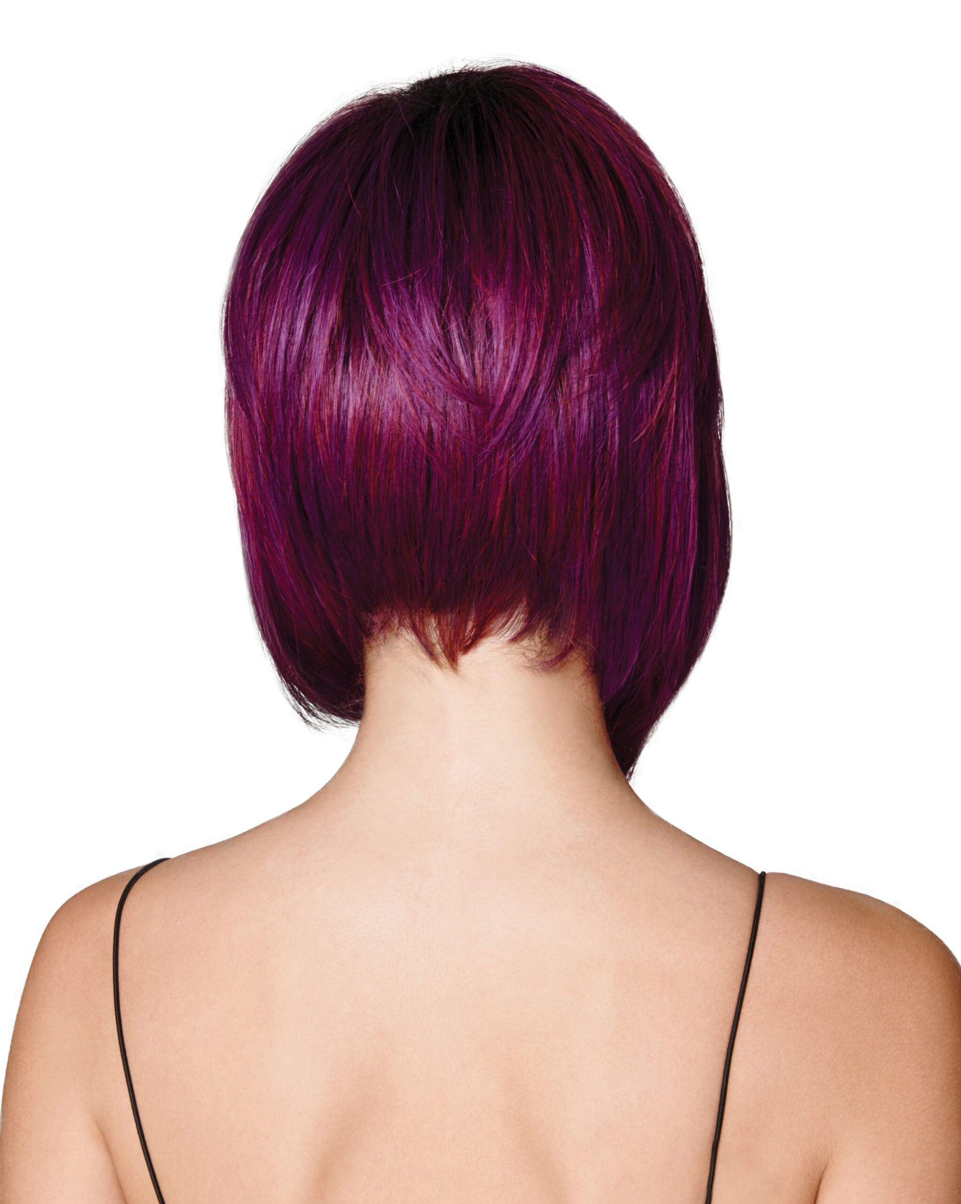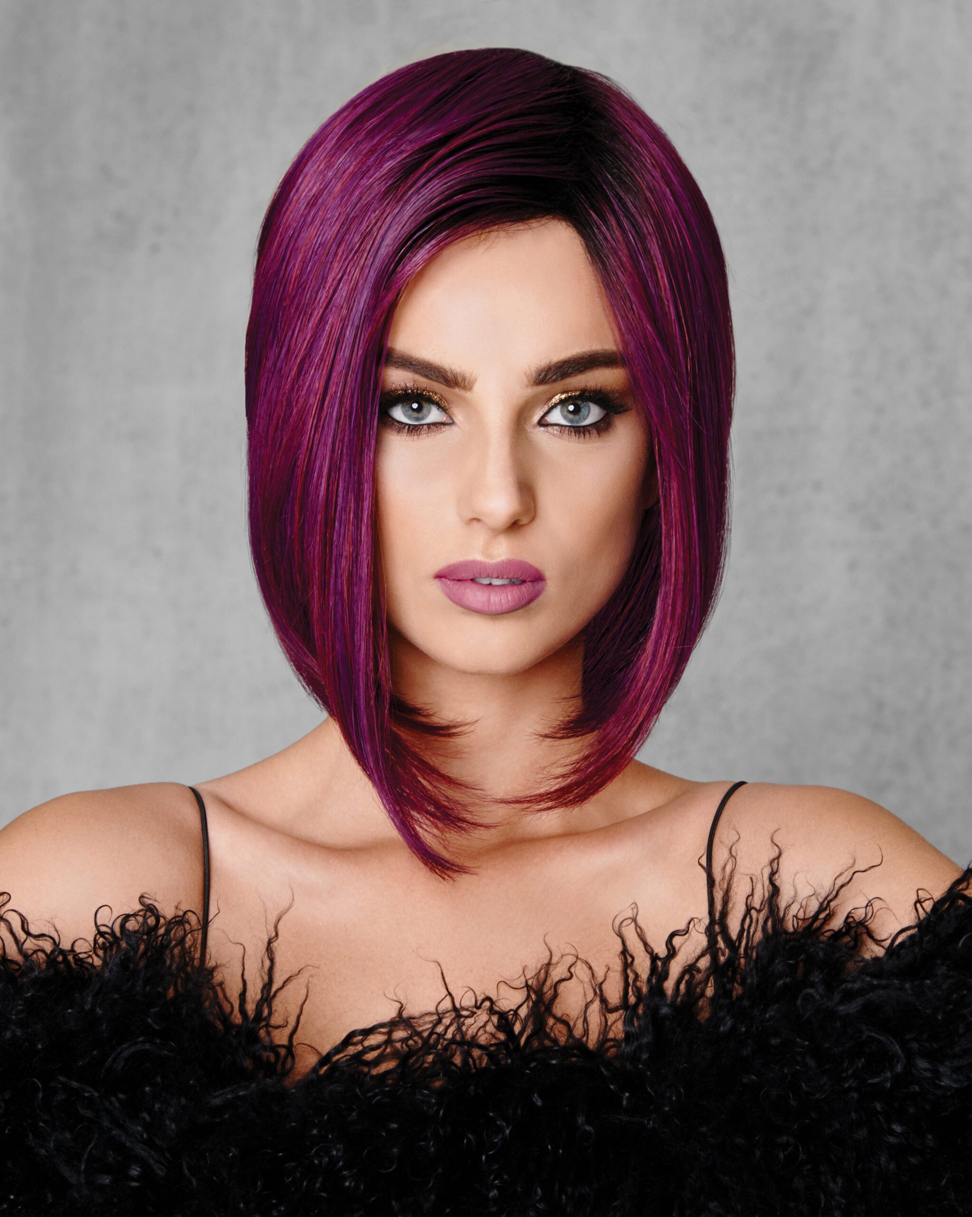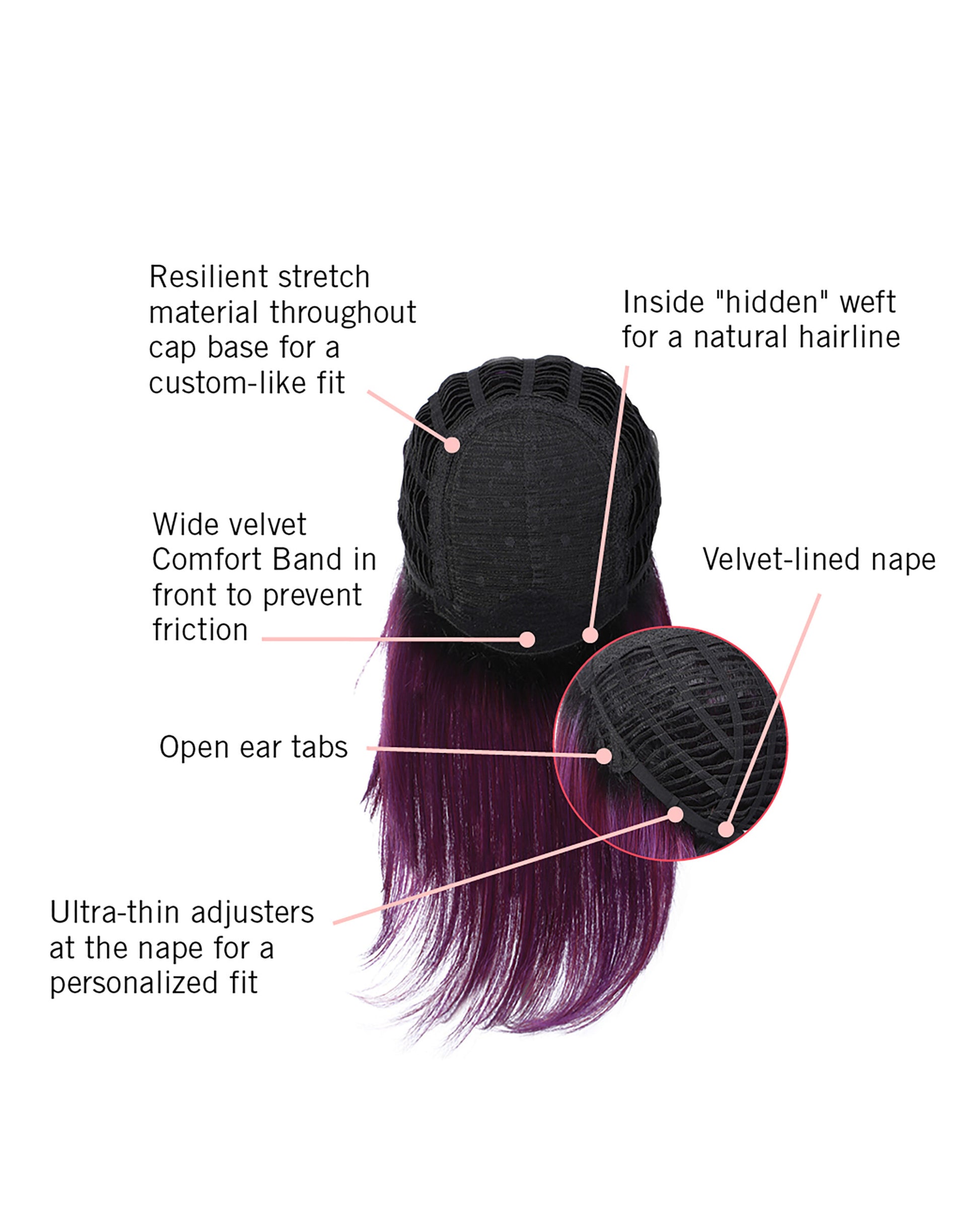 A dark and stormy blackberry wine shade with a touch of depth at the root gives this angled bob a wicked edge. One of today’s hottest hair color trends is super cool to wear all day long (or into the witching hour) thanks to our comfortable open-wefted cap. The style features a Wide Velvet Comfort Band™, Inside "Hidden" Weft, Open Ear Tabs, Velvet-Lined Nape, and Tru2Life® Heat-Friendly Synthetic Hair, making it both stylish and comfortable for extended wear.