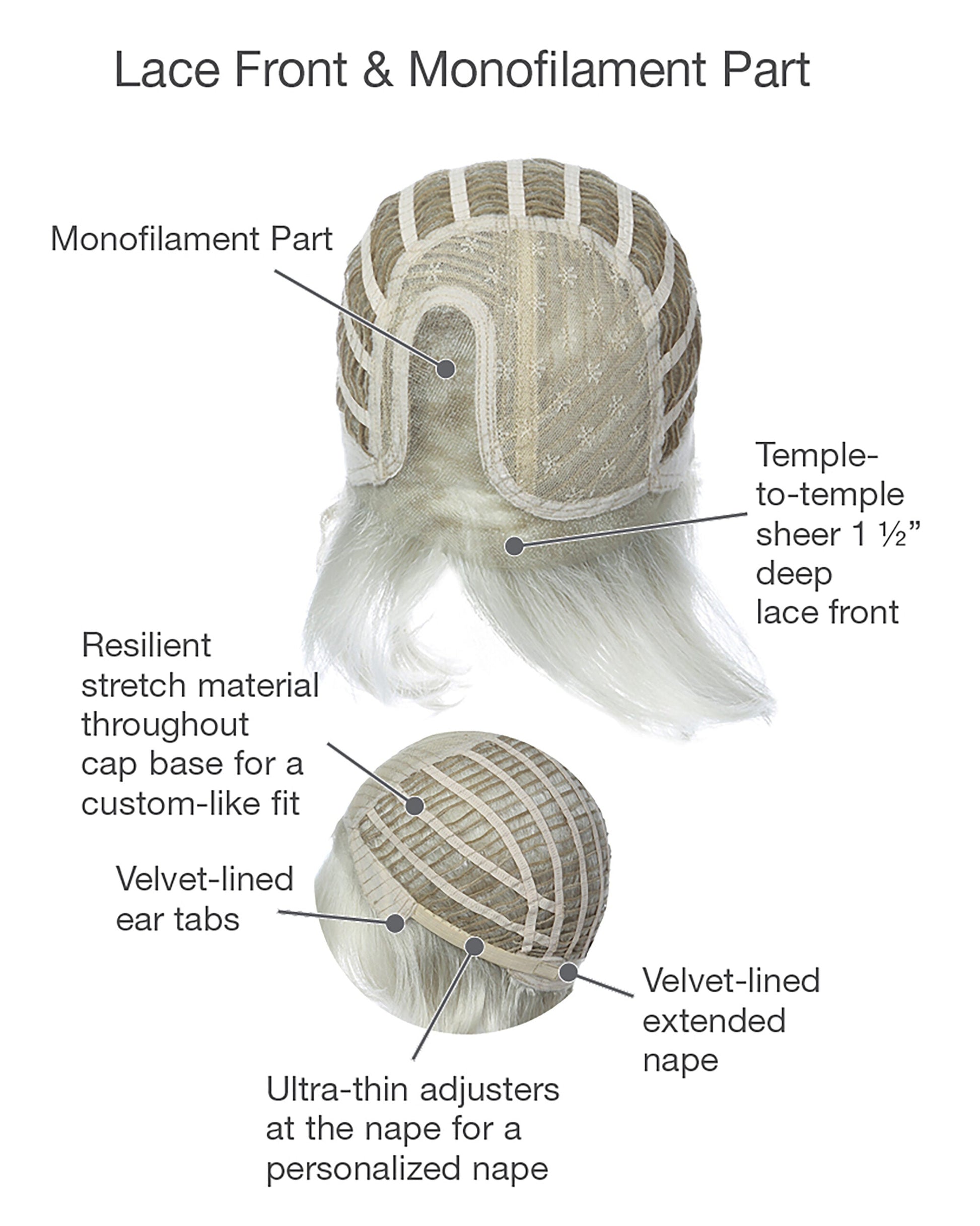 Cap Construction: Temple-to-Temple Lace Front, Monofilament Part, Velvet-Lined Ear Tabs, Velvet-Lined Extended Nape
