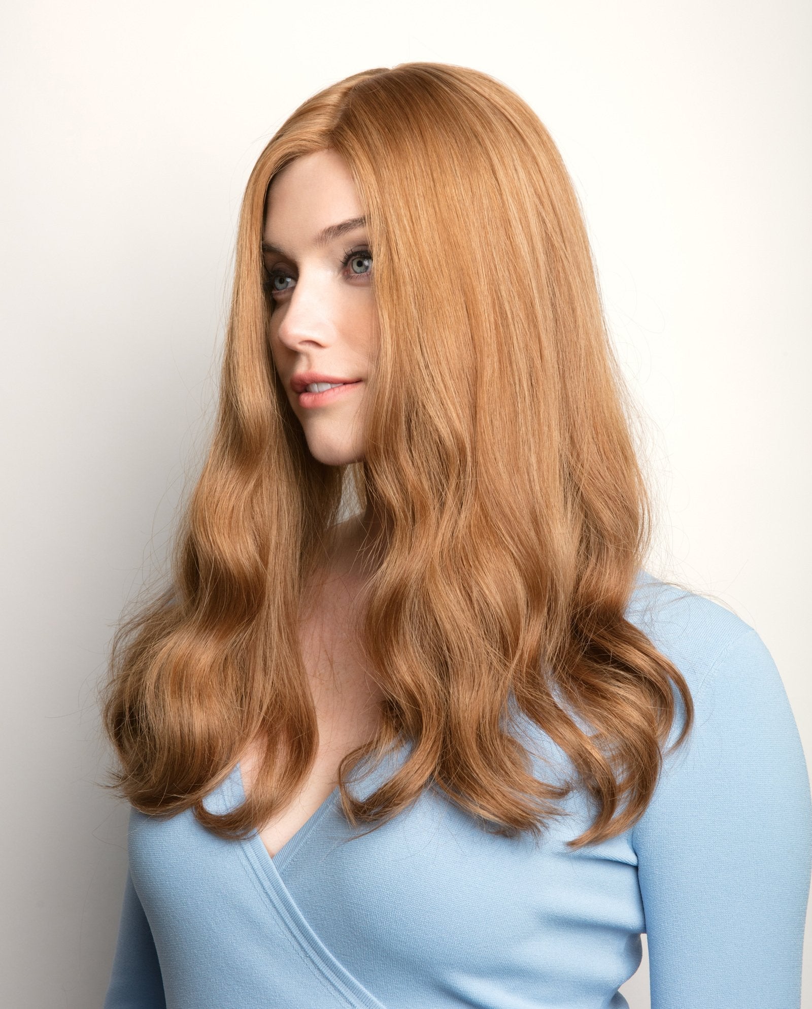 Penelope from the Fair Fashion Collection is a long-length human hair wig that offers a stunning, wavy style cascading freely down the mid-back, adding a touch of femininity and elegance. This ready-to-wear wig features a Natural Cap with a lace front, ensuring a breathable fit for all-day comfort. The top section is crafted with special lace mesh that conceals the knots, giving the illusion of hair growing directly from the scalp for an incredibly natural look. The Natural Cap is entirely hand-tied and includes polyurethane patches for optional use with double-sided tape, enhancing styling versatility.