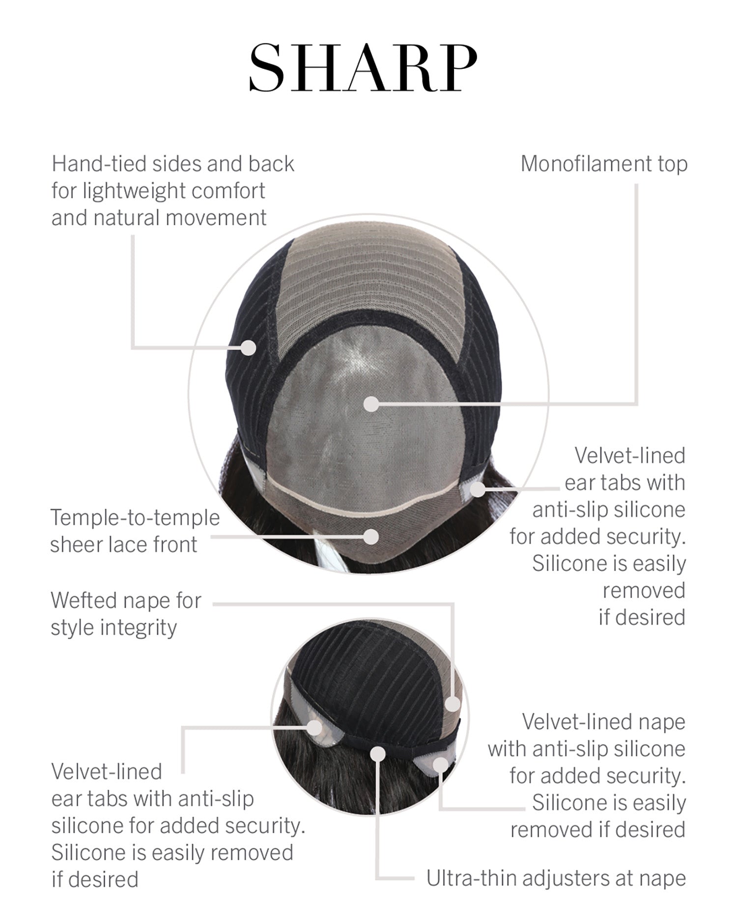 Cap Construction: Temple-To-Temple Lace Front, Monofilament Top, Hand-Tied Base, Anti-Slip Silicone-Lined Ear Tabs, Anti-Slip Silicone-Lined Extended Nape