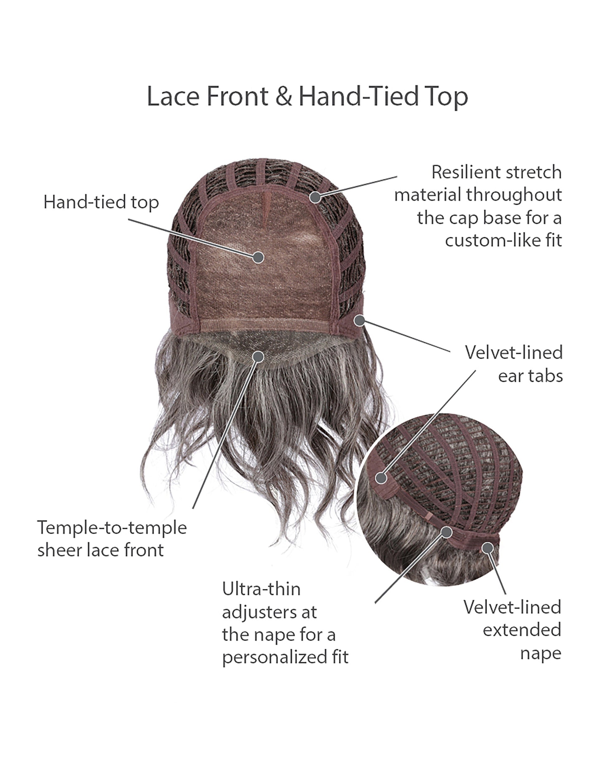 Cap Construction: Hand-tied Top, Temple-to-Temple Lace Front, Velvet-Lined Ear Tabs, Velvet-Lined Extended Nape
